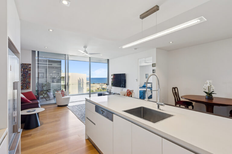 Inside, the apartment balances style with substance. Two spacious bedrooms are paired with two sleek bathrooms, while quality finishes bring warmth and texture throughout. Stone and timber detailing add character, and the kitchen is fully equipped with European appliances for effortless cooking and entertaining. The living zone is open and inviting, designed to soak up natural light and make the most of the coastal outlook.