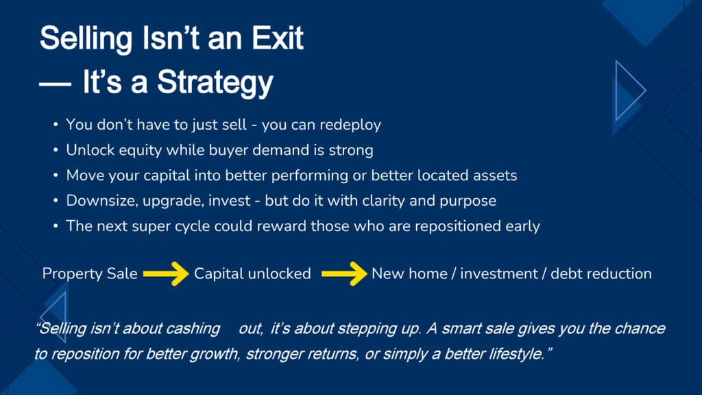 Should you be proactive in a rising market or sit back and enjoy the ride? At the risk of sounding like a broken record, the market continues to show strength with all the underlying fundamentals influencing growth. Outside of a Black Swan event, the safe haven of property continues to attract investment. It’s this very subject and the question of whether we’re at the beginning of a super cycle, that we discussed at length during our in-house seminar last week hosted by Nick Holt and Chris Shellabear. For me it raises the question of being in the best possible position to take advantage of this market and the slide below is the takeaway. For anyone wanting to see more detail CLICK HERE for the full presentation.
